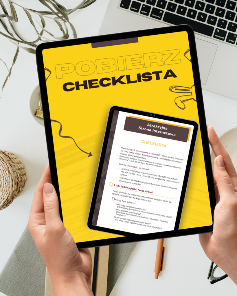 Jeżeli chcesz najpierw sprawdzić, czy Twoja strona wizualnie działa tak, jak powinna, pobierz checklistę „Atrakcyjna strona internetowa”. To konkretna lista rzeczy, które możesz przejść punkt po punkcie i zobaczyć, co warto poprawić. Bez technicznego żargonu. Bez kombinowania.
